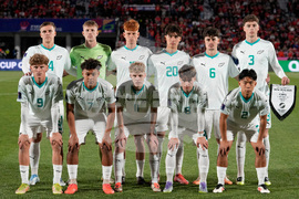 New Zealand's starting players pose for a team photo at the beginning of the FIFA U-20 World Cup Group A soccer match against Chile at National Stadium in Santiago, Chile, Saturday, Sept. 27, 2025. (AP Photo/Matias Delacroix)
