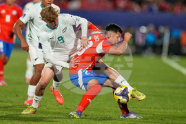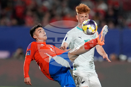 Chile's Ian Garguez, left, and New Zealand's Finn Mckenlay fight for the ball during a FIFA U-20 World Cup Group A soccer match at National Stadium in Santiago, Chile, Saturday, Sept. 27, 2025. (AP Photo/Matias Delacroix)