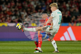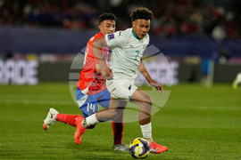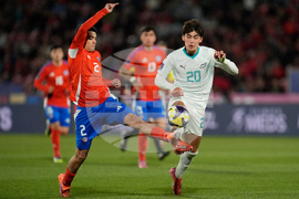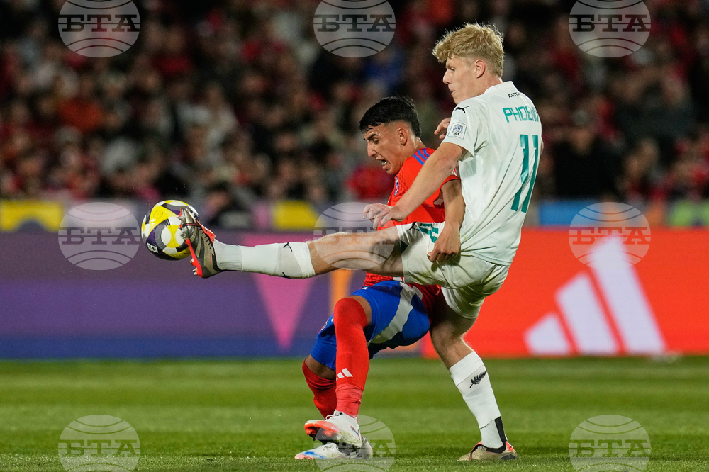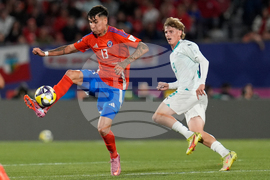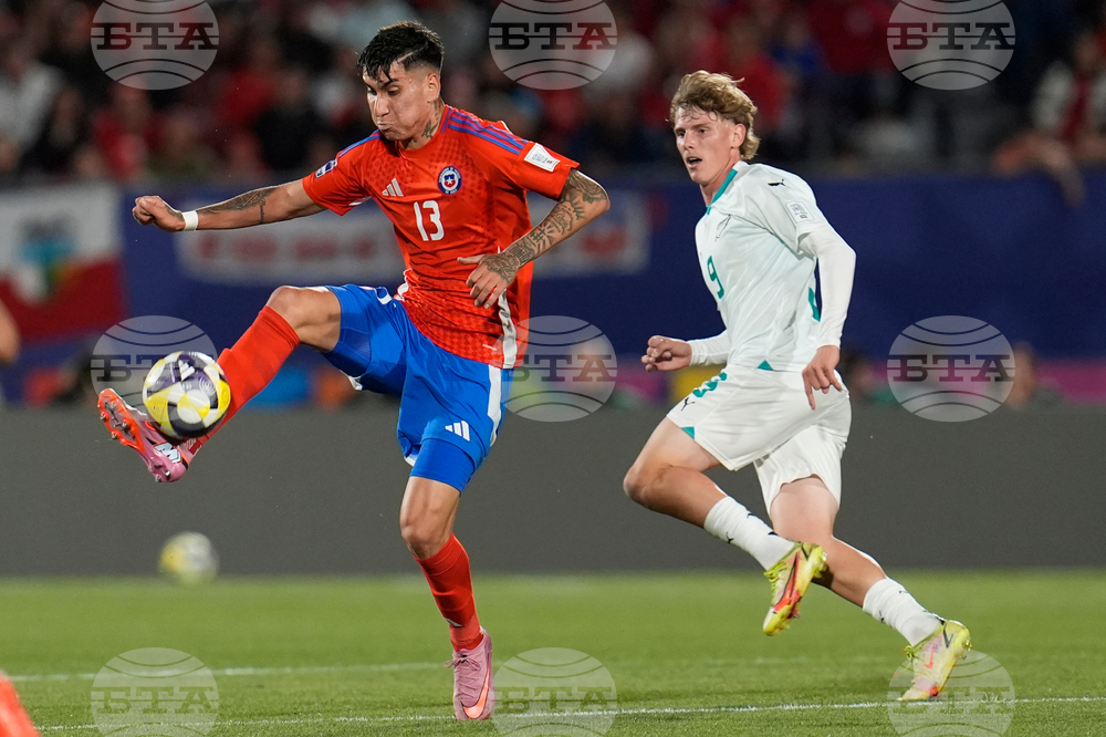 Chile's Matias Perez, left, controls a ball chased by New Zealand's Keegan Kelly during a FIFA U-20 World Cup Group A soccer match at National Stadium in Santiago, Chile, Saturday, Sept. 27, 2025. (AP Photo/Matias Delacroix)