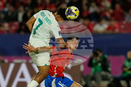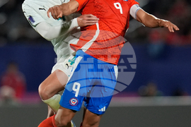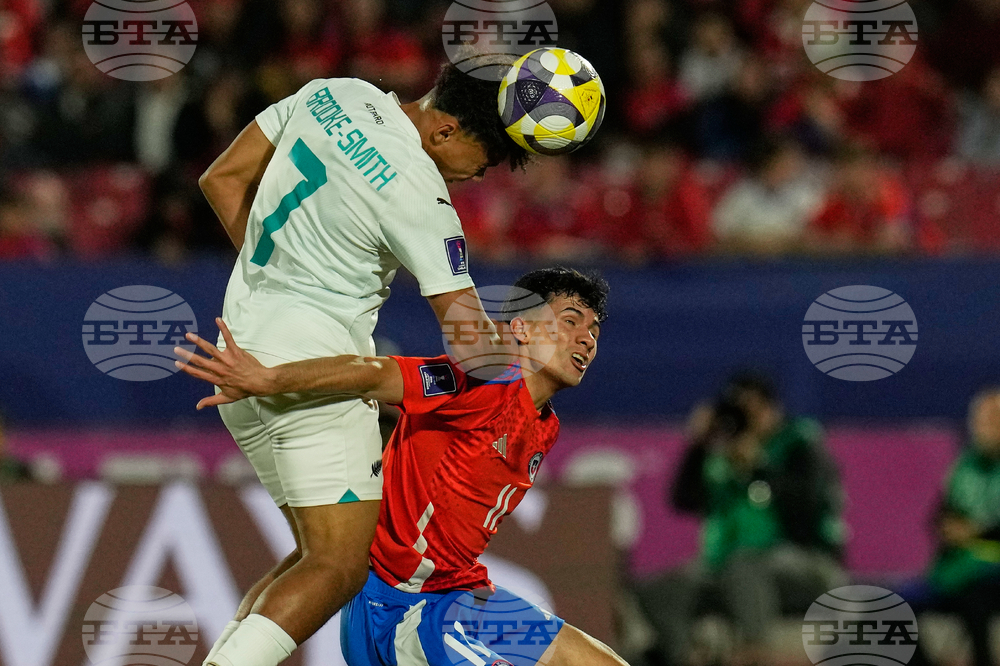 Chile's Juan Rossel, front, heads the ball next to New Zealand's James Bulkeley during a FIFA U-20 World Cup Group A soccer match at National Stadium in Santiago, Chile, Saturday, Sept. 27, 2025. (AP Photo/Matias Delacroix)