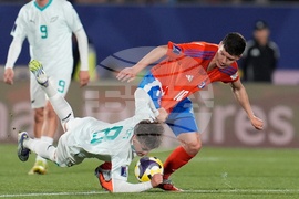 New Zealand's Stipe Ukich, front, and Chile's Ian Garguez fight for the ball during a FIFA U-20 World Cup Group A soccer match at National Stadium in Santiago, Chile, Saturday, Sept. 27, 2025. (AP Photo/Matias Delacroix)