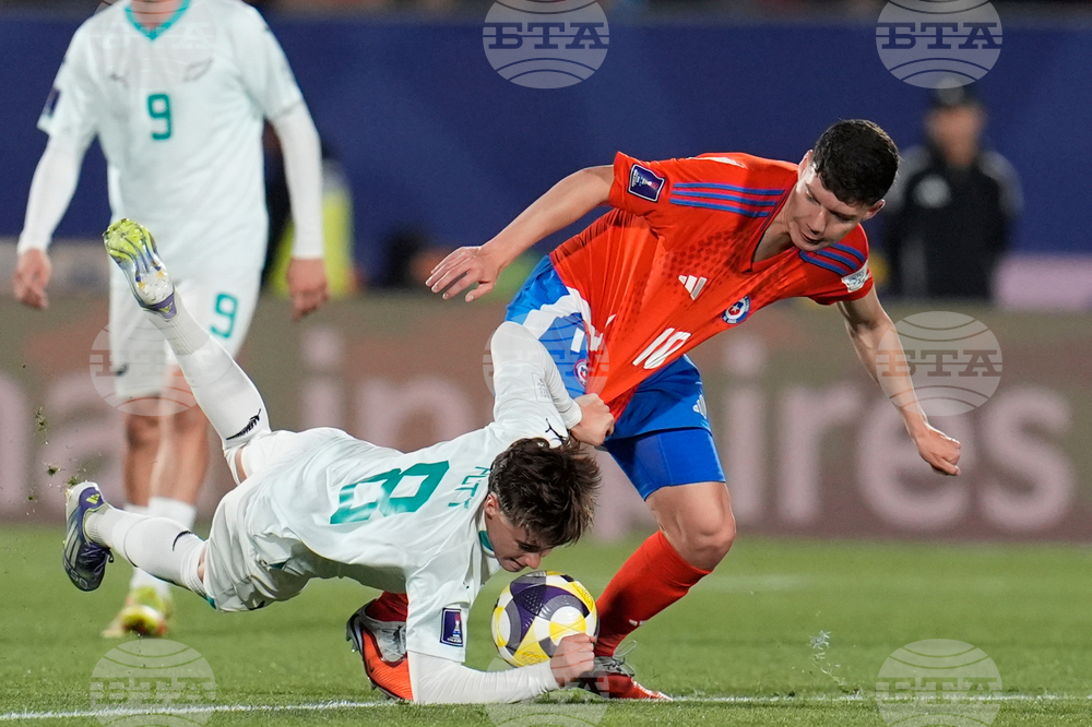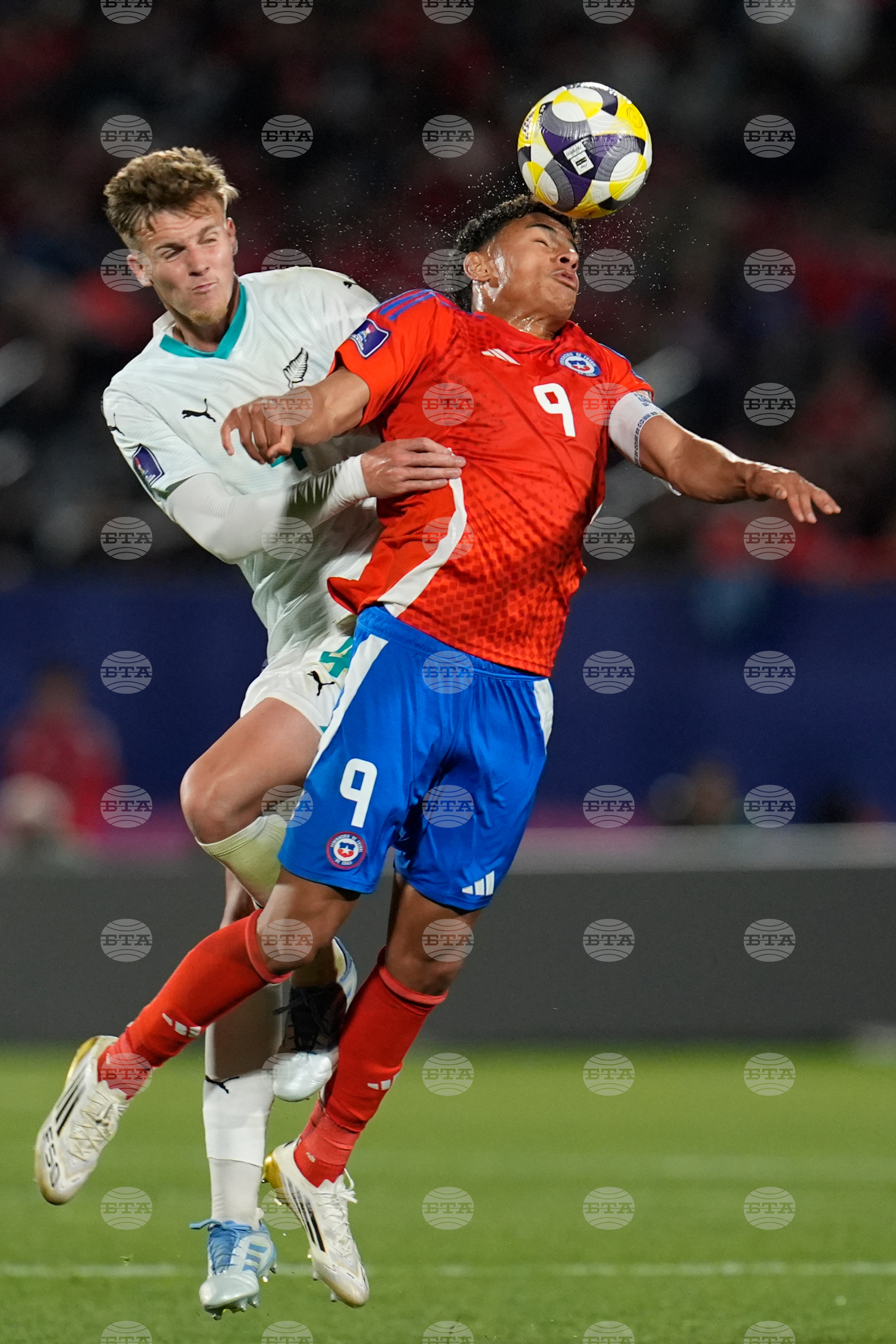 New Zealand's Stipe Ukich, left, and Chile's Felipe Faundez fight for the ball during a FIFA U-20 World Cup Group A soccer match at National Stadium in Santiago, Chile, Saturday, Sept. 27, 2025. (AP Photo/Esteban Felix)