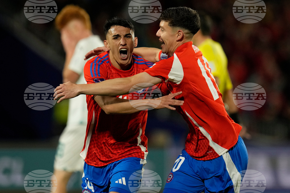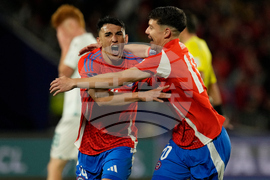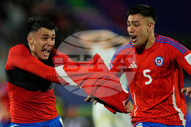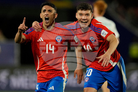 Chile's Ian Garguez, left, celebrates after scoring his side's second goal against New Zealand uring a FIFA U-20 World Cup Group A soccer match at National Stadium in Santiago, Chile, Saturday, Sept. 27, 2025. (AP Photo/Esteban Felix)