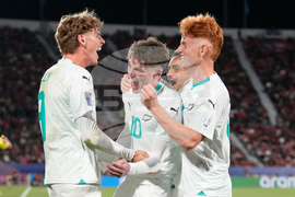 New Zealand's Nathan Walker, center, celebrates after scoring his side's first goal against Chile during a FIFA U-20 World Cup Group A soccer match at National Stadium in Santiago, Chile, Saturday, Sept. 27, 2025. (AP Photo/Matias Delacroix)