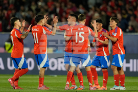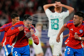 Chile's players react at the end of a FIFA U-20 World Cup Group A soccer match against New Zealand at National Stadium in Santiago, Chile, Saturday, Sept. 27, 2025. (AP Photo/Matias Delacroix)