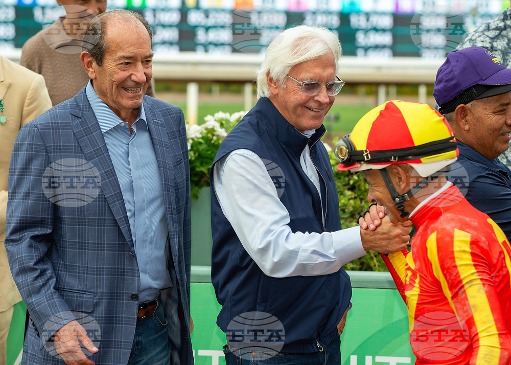 Co-owner Karl Watson, left, trainer Bob Baffert and jockey Mike Smith celebrate after Smith guided Nevada Beach to victory the Grade I $300,000 Goodwood Stakes Saturday, September 27, 2025 at Santa Anita Park, Arcadia, Calif. (Benoit Photo via AP)
