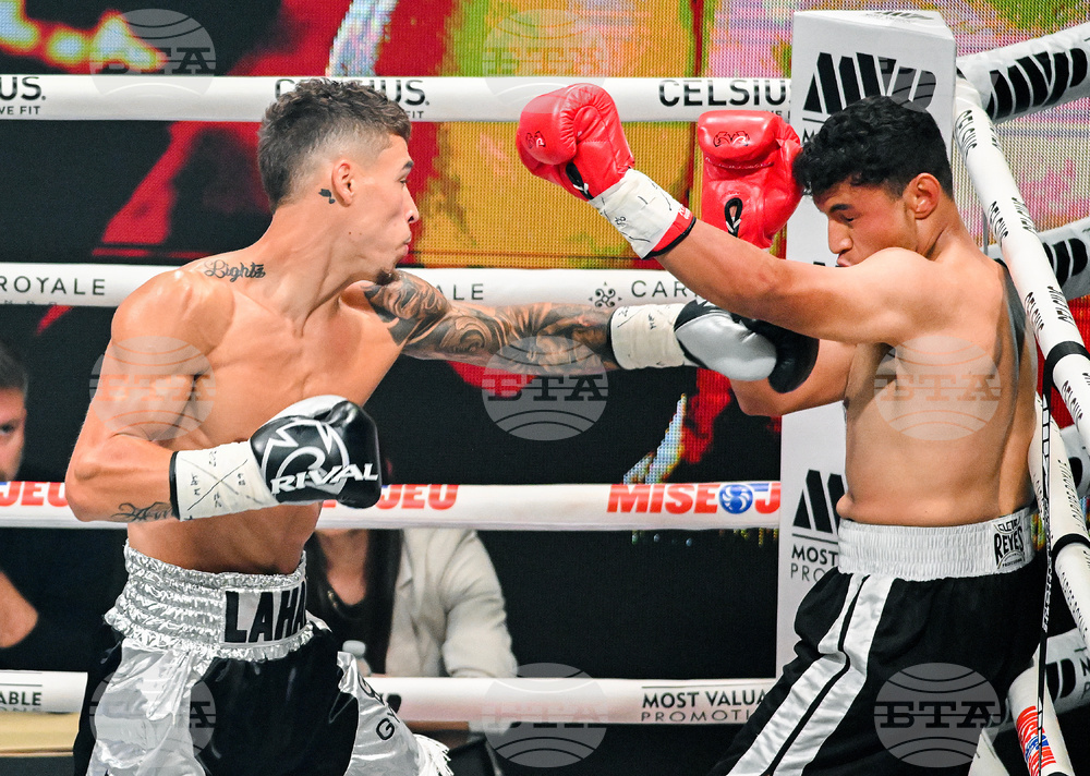 Loick Lahaie, left, and Jose Rodriguez during their fight at the Most Valuable Prospects 15 event in Montreal, Saturday Sept. 27, 2025. (Graham Hughes/The Canadian Press via AP)