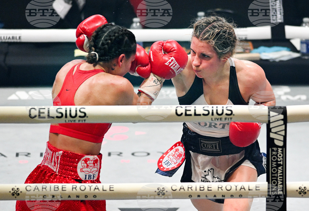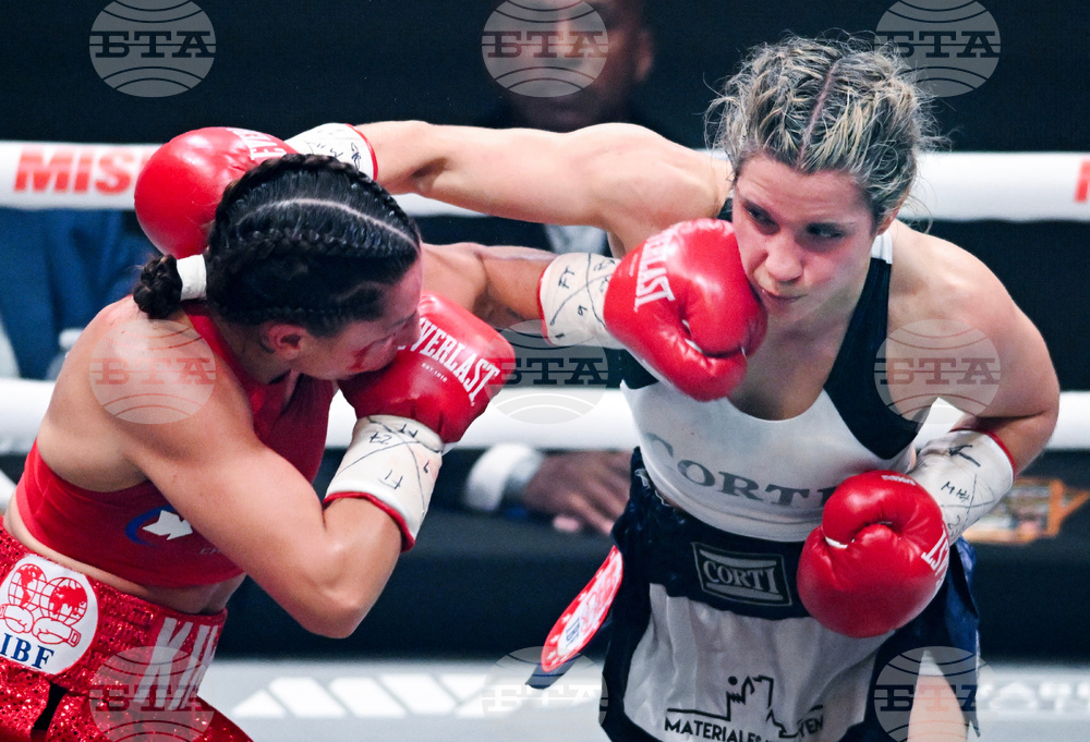 Kim Clavel, left, lands a head shot to Sol Cudos during their IBF World Mini Flyweight Championship fight in Montreal, Saturday, Sept. 27, 2025. (Graham Hughes/The Canadian Press via AP)