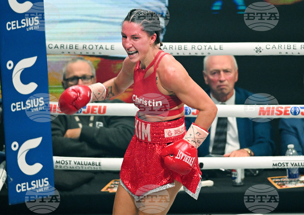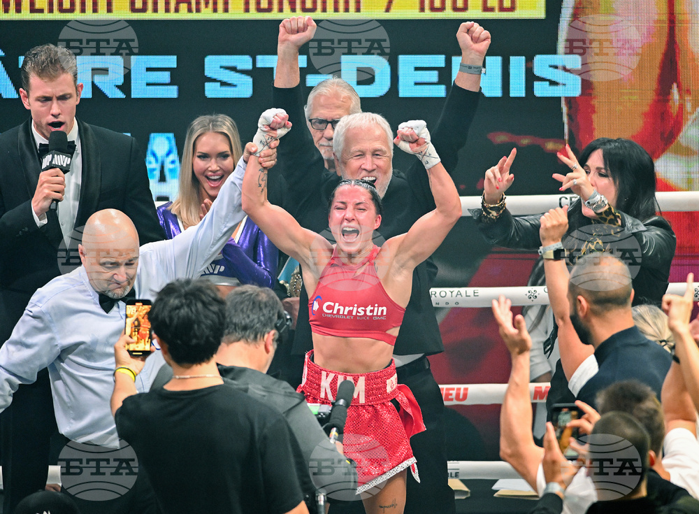 Kim Clavel, center, reacts following her win against Sol Cudos during their IBF World Mini Flyweight Championship fight in Montreal, Saturday, Sept. 27, 2025. (Graham Hughes/The Canadian Press via AP)