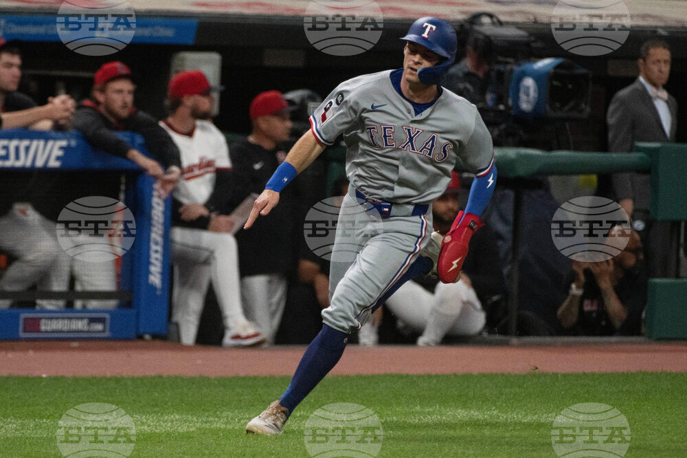 Texas Rangers' Michael Helman heads for home plate a double by Josh Jung during the first inning of a baseball game, Saturday, Sept. 27, 2025, in Cleveland. (AP Photo/Phil Long)