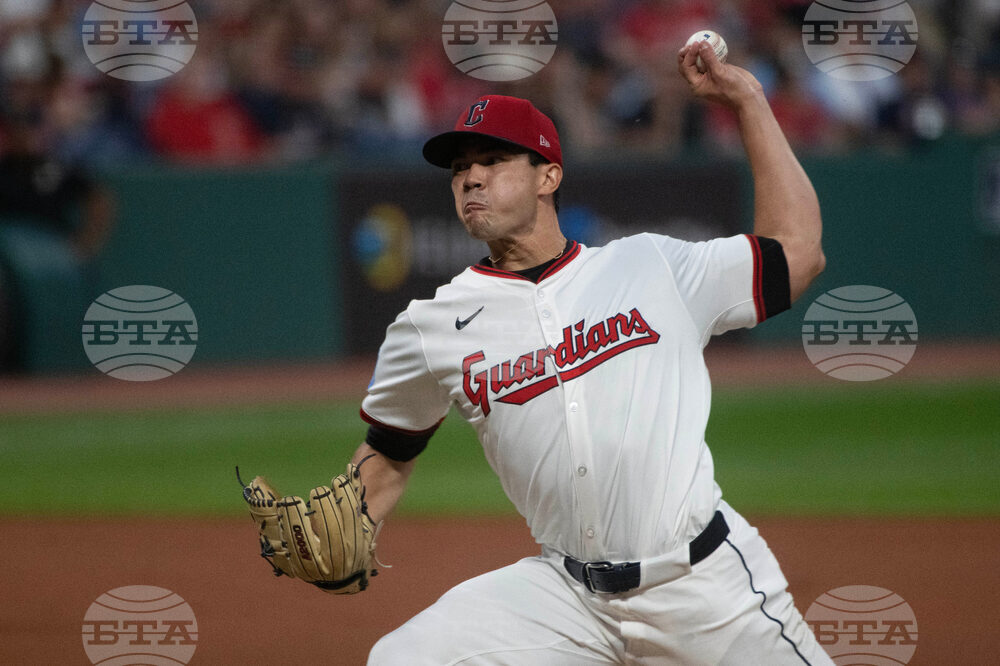 Cleveland Guardians starting pitcher Logan Allen delivers against the Texas Rangers during the first inning of a baseball game, Sunday, Sept. 28, 2025, in Cleveland. (AP Photo/Phil Long)