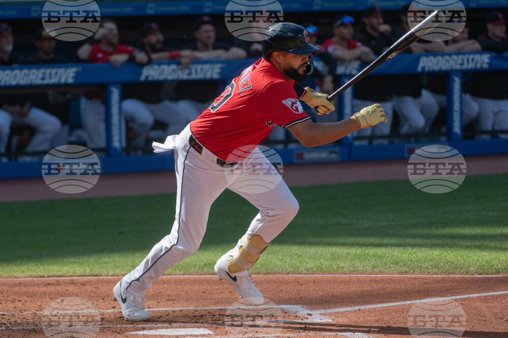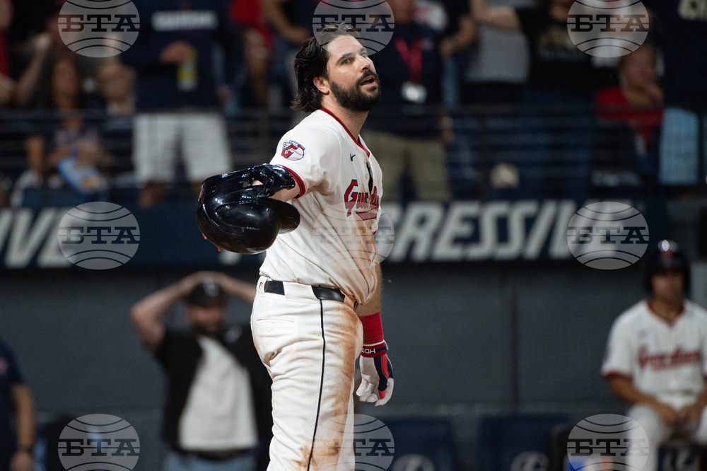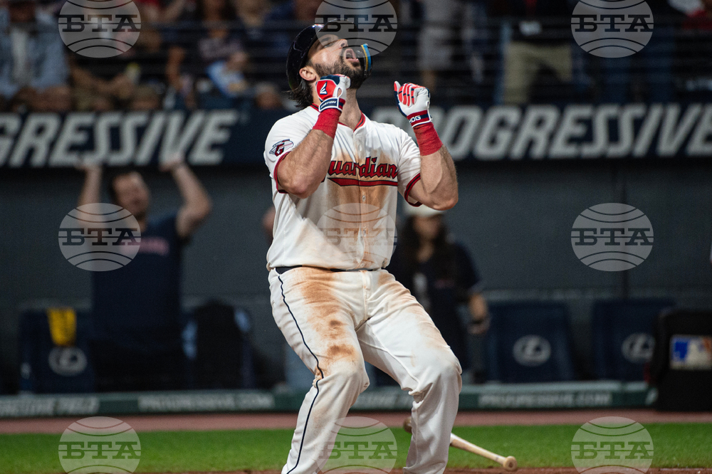 Cleveland Guardians' Jose Ramirez watches his single off Texas Rangers starting pitcher Patrick Corbin during the third inning of a baseball game, Sunday, Sept. 28, 2025, in Cleveland. (AP Photo/Phil Long)