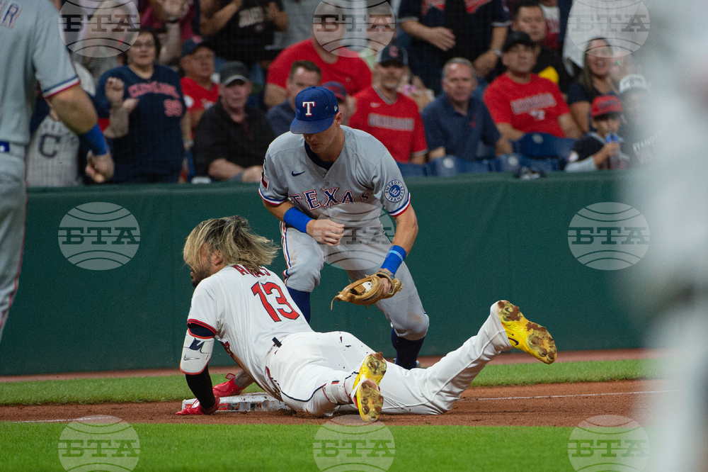 Texas Rangers' Ezequiel Duran throws out Cleveland Guardians' Jose Ramirez at first base during the fourth inning of a baseball game, Saturday, Sept. 27, 2025, in Cleveland. (AP Photo/Phil Long)