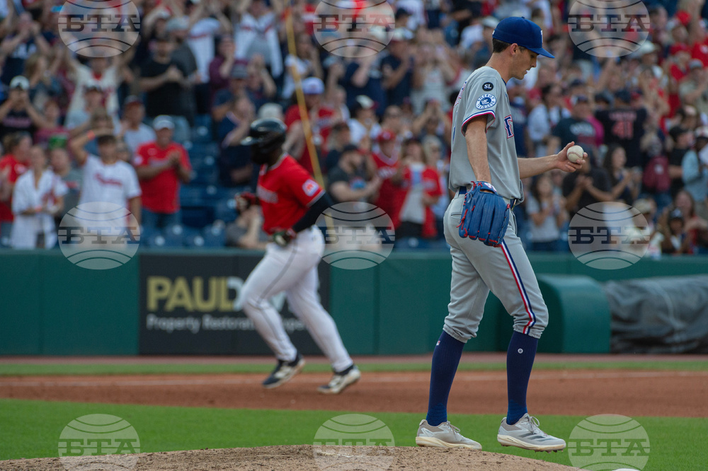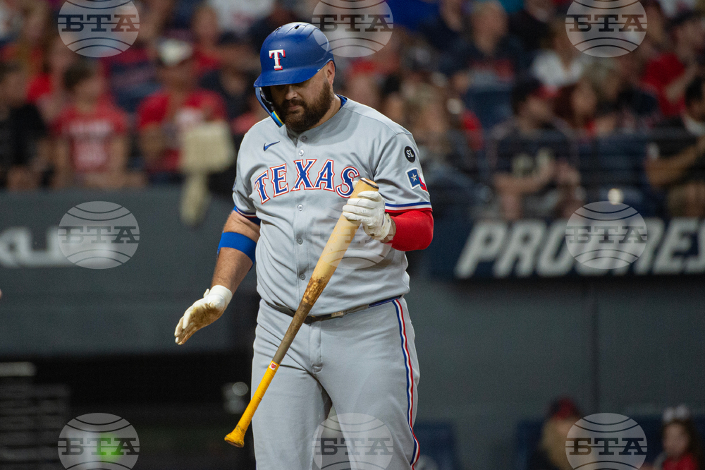 Texas Rangers' Rowdy Tellez reacts after a strike out by Cleveland Guardians starting pitcher Hunter Gaddis during the seventh inning of a baseball game, Saturday, Sept. 27, 2025, in Cleveland. (AP Photo/Phil Long)