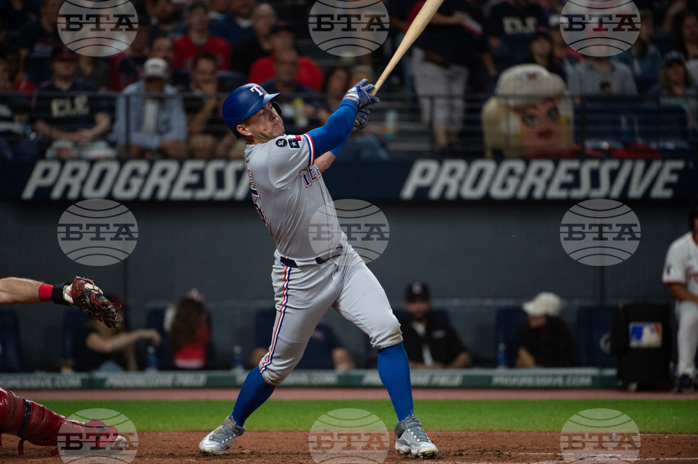 Texas Rangers' Dylan Moore hits a single off Cleveland Guardians relief pitcher Erik Sabrowski during the eighth inning of a baseball game, Saturday, Sept. 27, 2025, in Cleveland. (AP Photo/Phil Long)