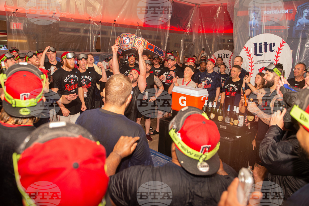 Cleveland Guardians' Austin Hedges, center with belt, celebrates with his teammates after securing an American League playoff spot after a baseball game against the Texas Rangers, Saturday, Sept. 27, 2025, in Cleveland. (AP Photo/Phil Long)