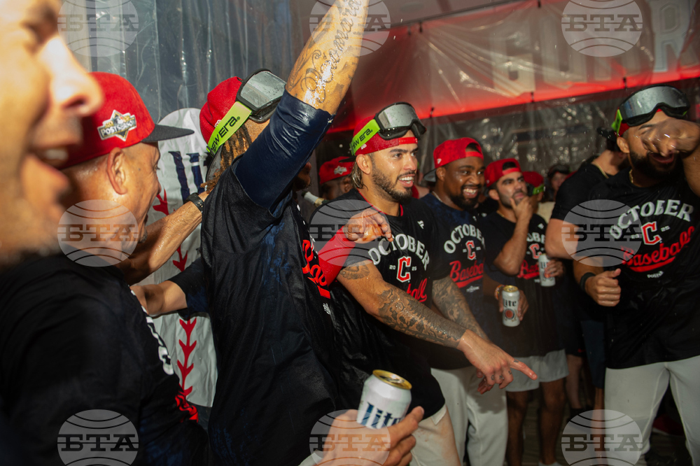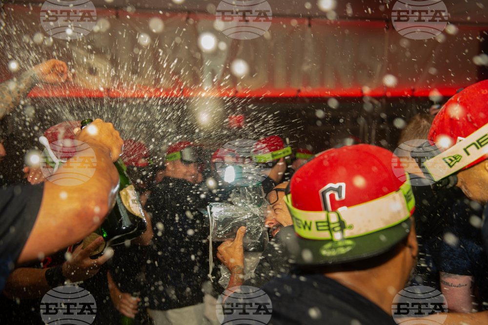 Cleveland Guardians' Gabriel Arias, center pointing, celebrates with teammates after securing an American League playoff spot after a baseball game against the Texas Rangers, Saturday, Sept. 27, 2025, in Cleveland. (AP Photo/Phil Long)