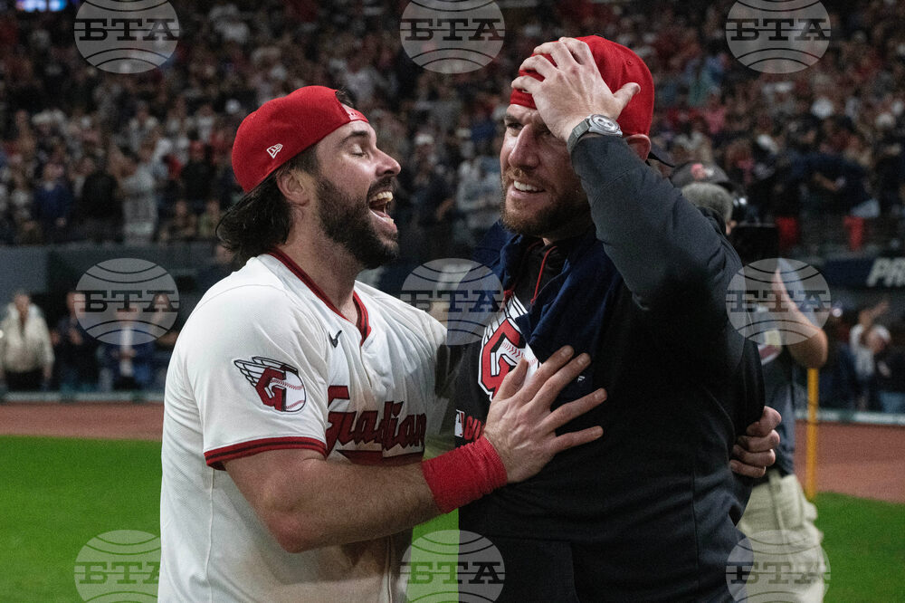 The Cleveland Guardians celebrate securing an American League playoff spot at the end of a baseball game against the Texas Rangers, Saturday, Sept. 27, 2025, in Cleveland. (AP Photo/Phil Long)