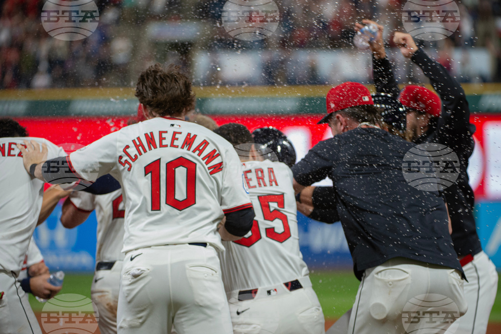 Cleveland Guardians' Daniel Schneemann (10) and his teammates shower CJ Kayfus, not seen, after Kayfus was hit by a pitch from Texas Rangers relief pitcher Robert Garcia, scoring the winning run against the Rangers at the end of a baseball game, Saturday, Sept. 27, 2025, in Cleveland. (AP Photo/Phil Long)