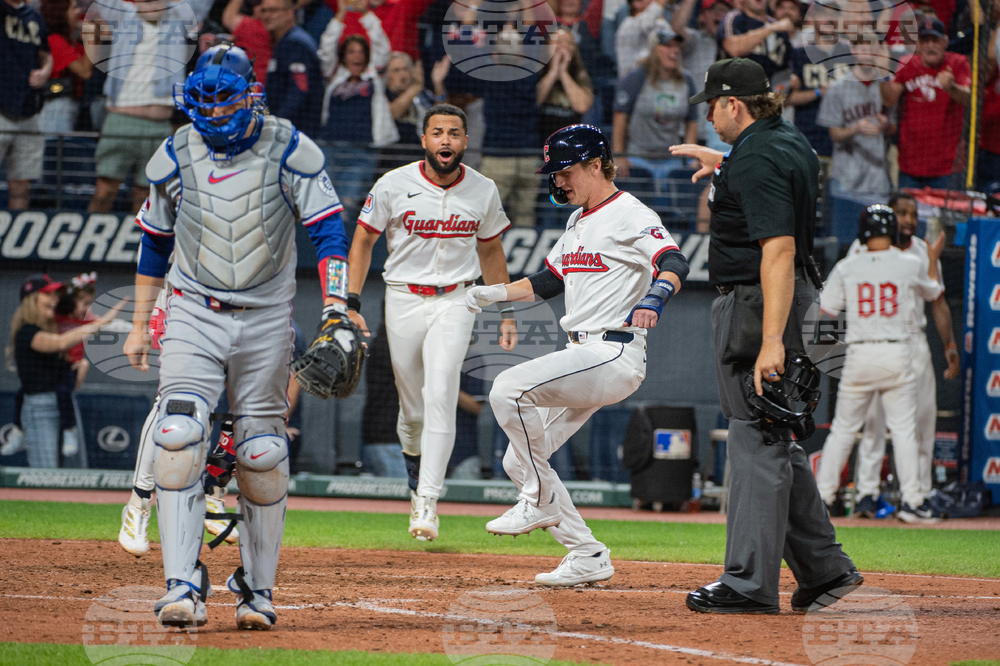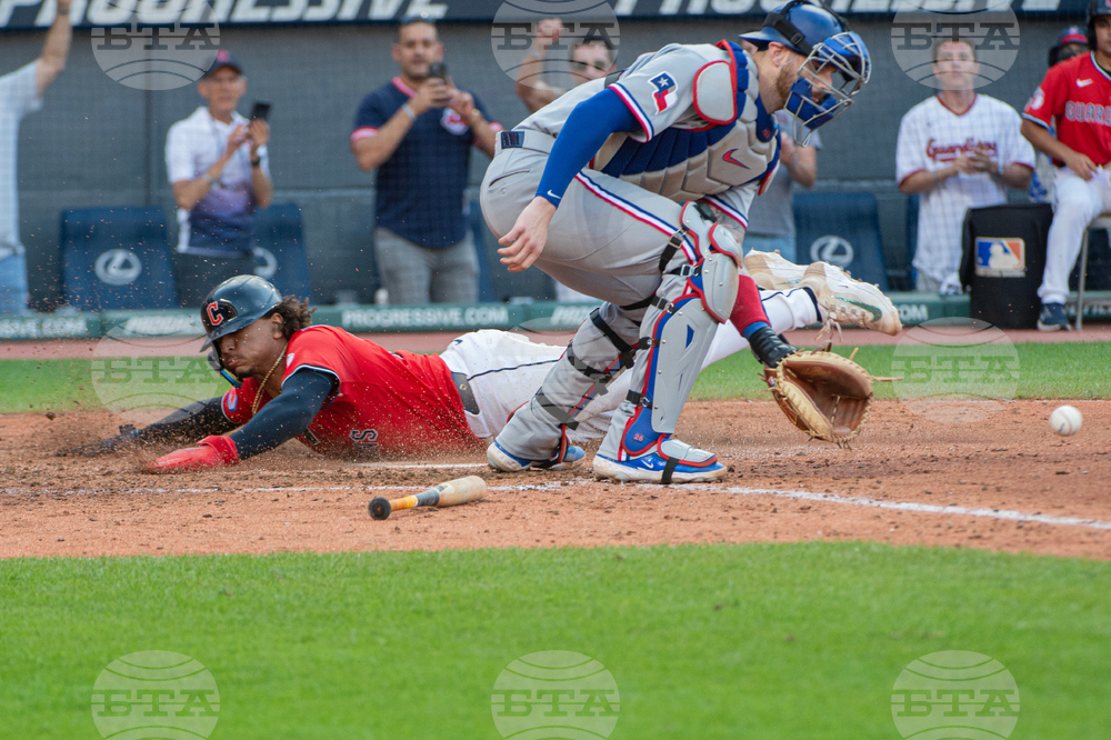 Cleveland Guardians' Bo Naylor, left, scores on a sacrifice fly hit by teammate Brayan Rocchio as Texas Rangers' Jonah Heim, right, waits for the throw during the eighth inning of a baseball game, Sunday, Sept. 28, 2025, in Cleveland. (AP Photo/Phil Long)