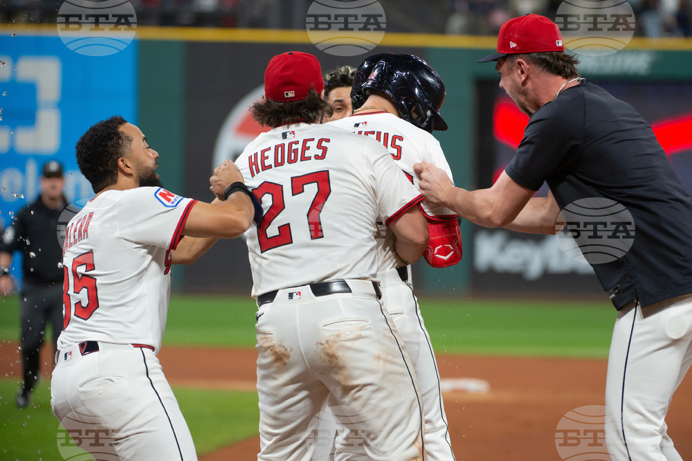 Cleveland Guardians' George Valera, left, Austin Hedges (27) and teammates grab CJ Kayfus at first base after Kay's was hit by a pitch from Texas Rangers relief pitcher Robert Garcia that scored the winning run against the Rangers at the end of a baseball game, Saturday, Sept. 27, 2025, in Cleveland. (AP Photo/Phil Long)