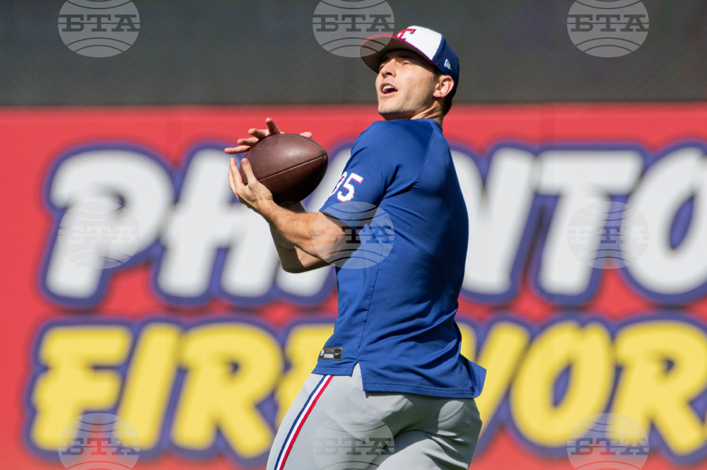 Texas Rangers starting pitcher Jack Leiter catches a pass during warmups before a baseball game against the Cleveland Guardians, Sunday, Sept. 28, 2025, in Cleveland. (AP Photo/Phil Long)