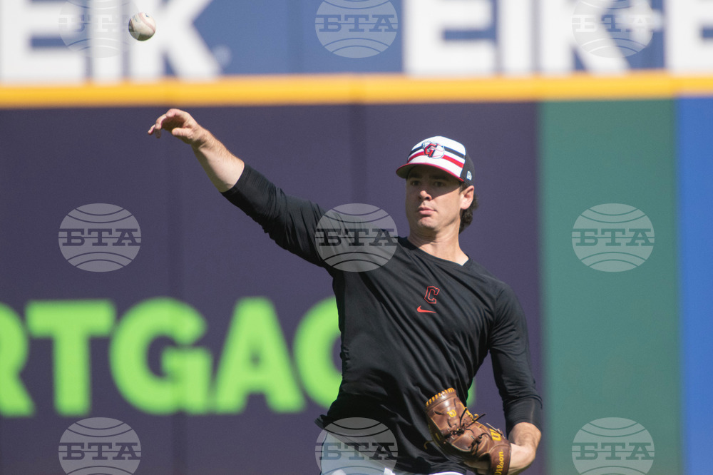 Cleveland Guardians relief pitcher Matt Festa warms up before a baseball game against the Texas Rangers, Sunday, Sept. 28, 2025, in Cleveland. (AP Photo/Phil Long)