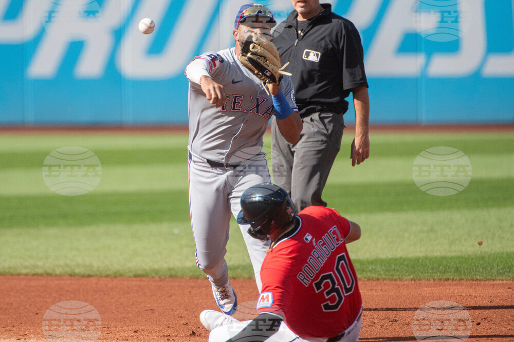 Texas Rangers' Ezequiel Duran, top left, is late with his throw to first base after forcing out Cleveland Guardians' Johnathan Rodriguez (30) at second base during a baseball game, Sunday, Sept. 28, 2025, in Cleveland. (AP Photo/Phil Long)
