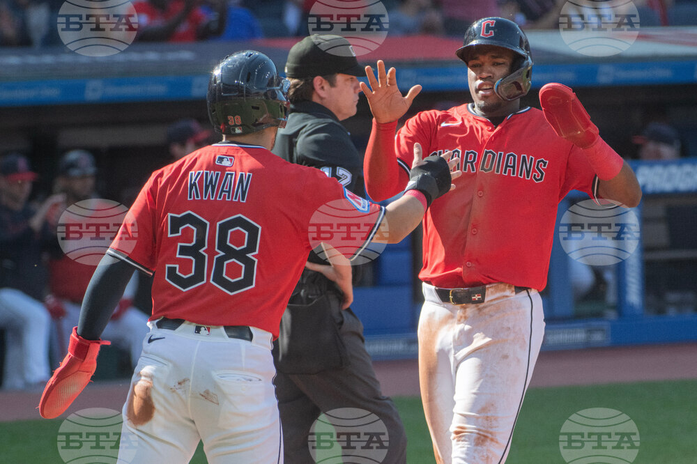 Cleveland Guardians' Steven Kwan (38) congratulates Angel Martinez, right, after they scored on a single by Johnathan Rodriguez during the first inning of a baseball game against the Texas Rangers, Sunday, Sept. 28, 2025, in Cleveland. (AP Photo/Phil Long)