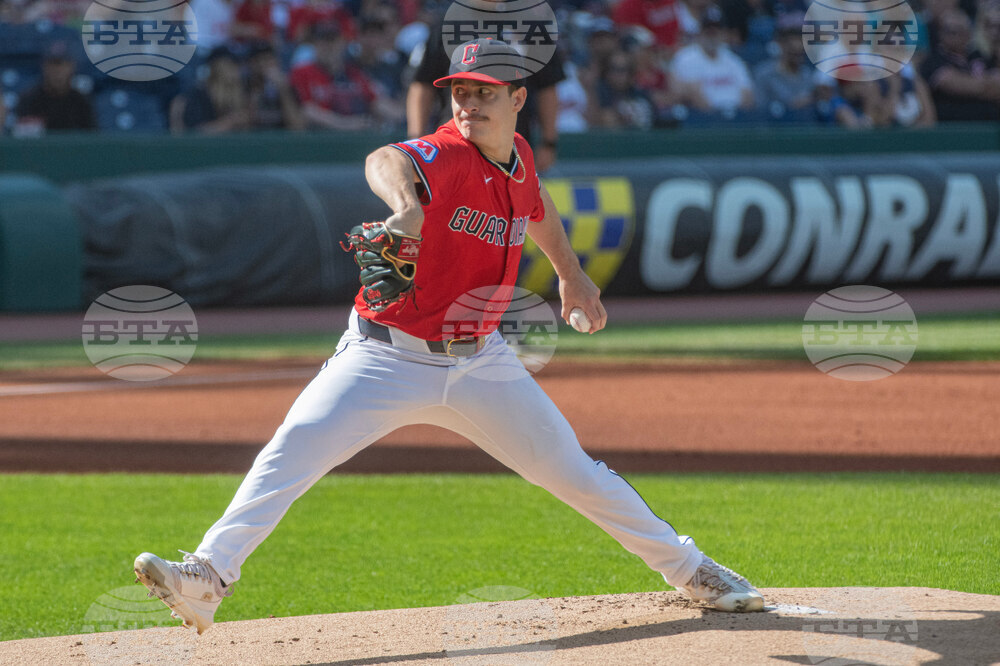 Cleveland Guardians starting pitcher Joey Cantillo delivers against the Texas Rangers during the first inning of a baseball game, Saturday, Sept. 27, 2025, in Cleveland. (AP Photo/Phil Long)