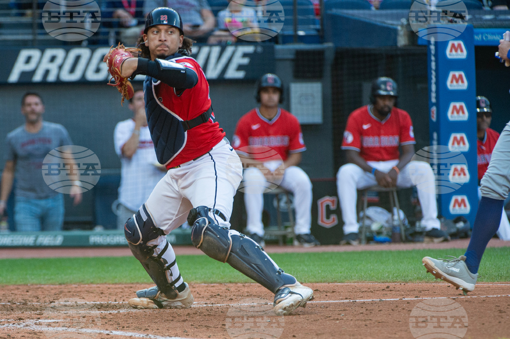 Cleveland Guardians' Gabriel Arias throws out Texas Rangers' Cody Freeman at first base during the first inning of a baseball game, Saturday, Sept. 27, 2025, in Cleveland. (AP Photo/Phil Long)