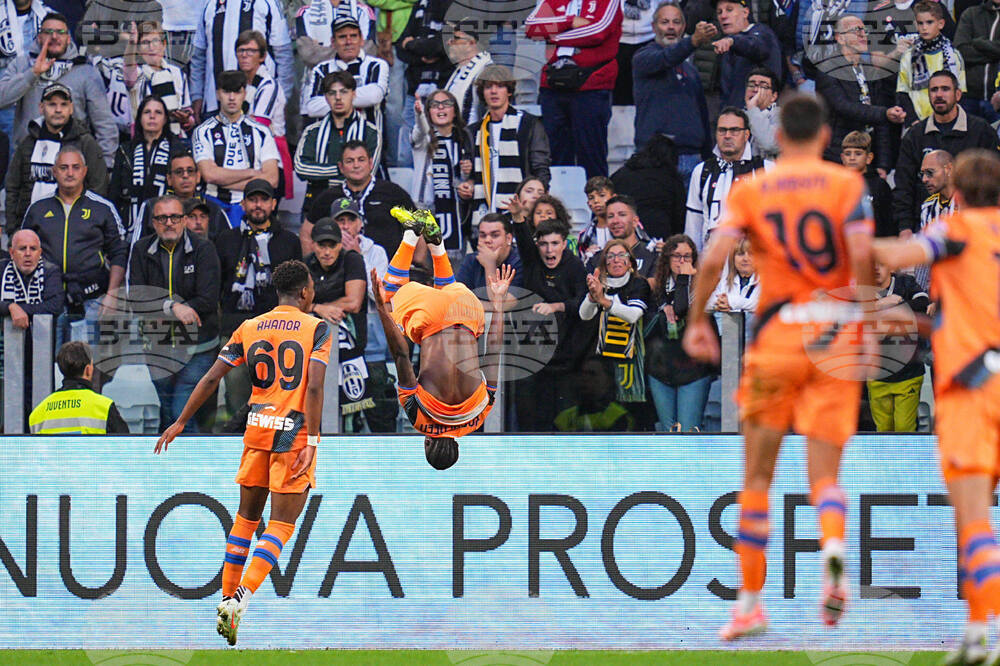 Atalanta's Kamaldeen Sulemana celebrates after scoring, during the Serie A soccer match between Juventus and Atalanta at the Allianz Stadium in Turin, north west Italy, Saturday, Sept. 27, 2025. (Marco Alpozzi/LaPresse via AP)