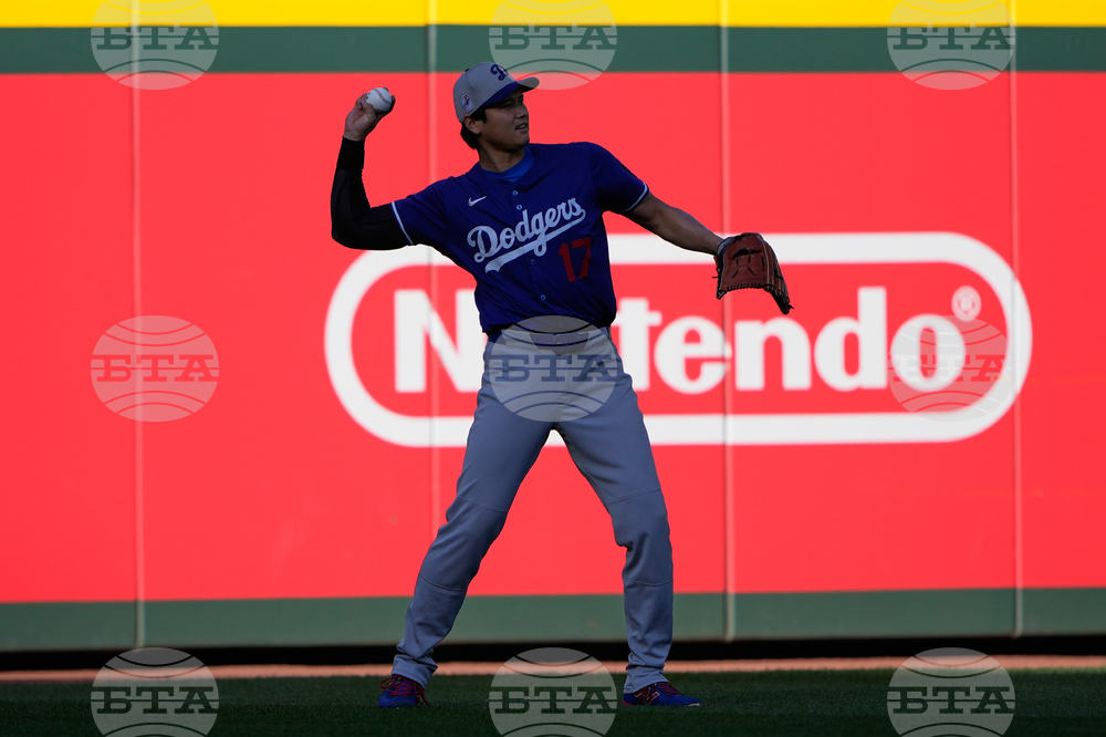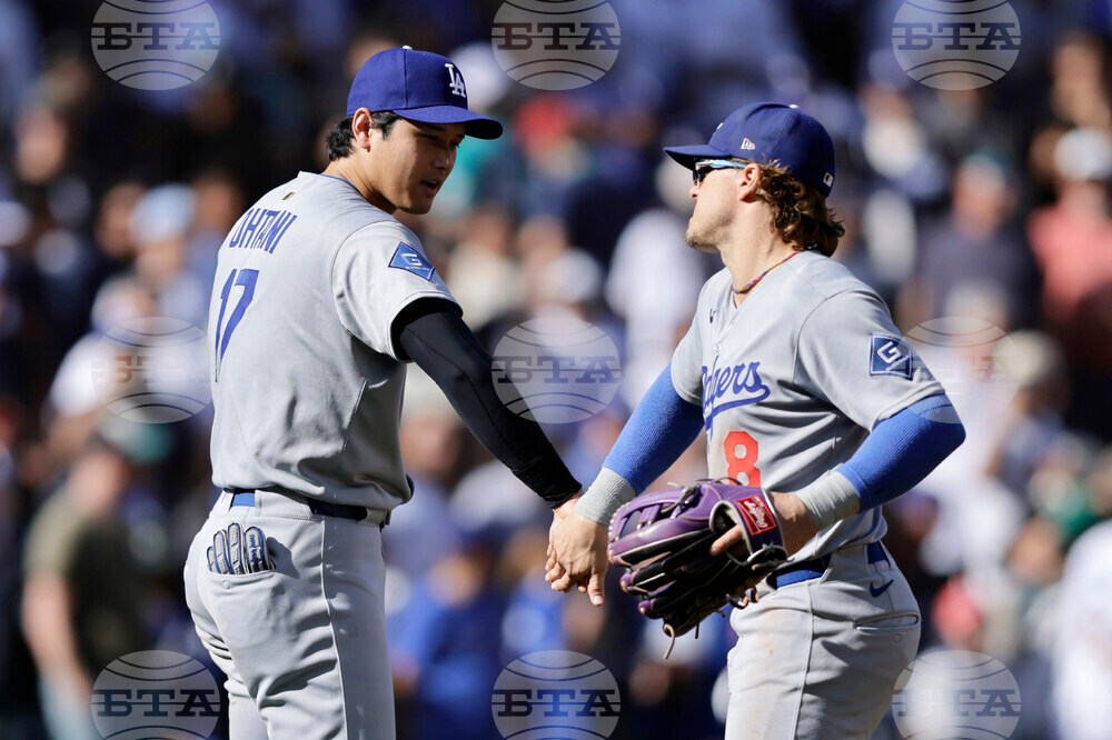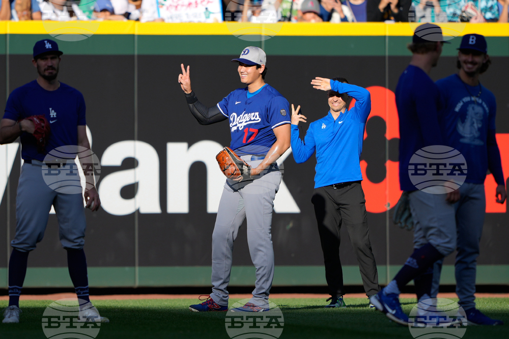 Los Angeles Dodgers' Shohei Ohtani (17) gestures as players warm up before a baseball game against the Seattle Mariners, Saturday, Sept. 27, 2025, in Seattle. (AP Photo/Ryan Sun)