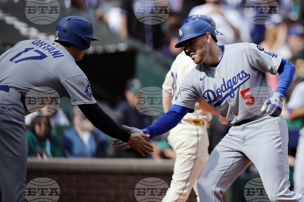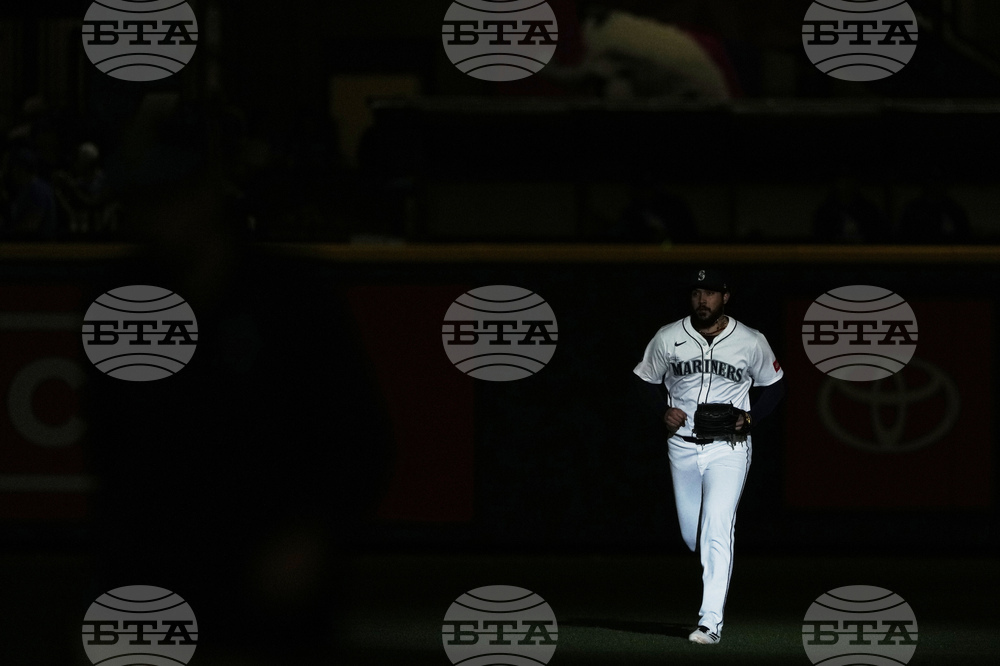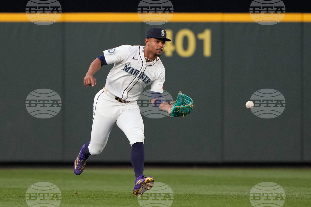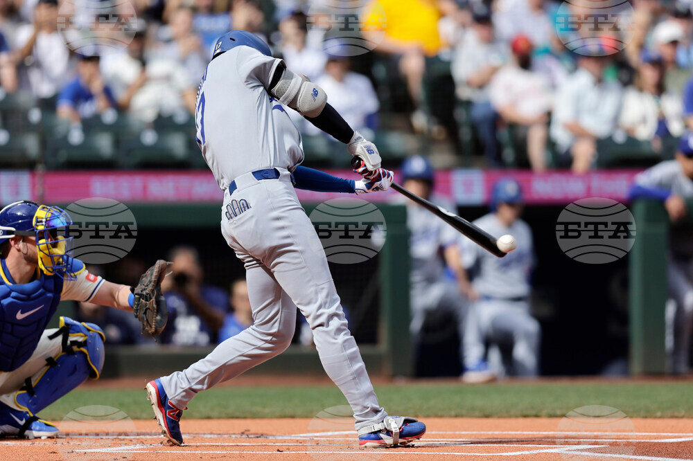 Seattle Mariners center fielder Julio Rodriguez fields a single hit by Los Angeles Dodgers' Freddie Freeman during the first inning of a baseball game, Saturday, Sept. 27, 2025, in Seattle. (AP Photo/Ryan Sun)