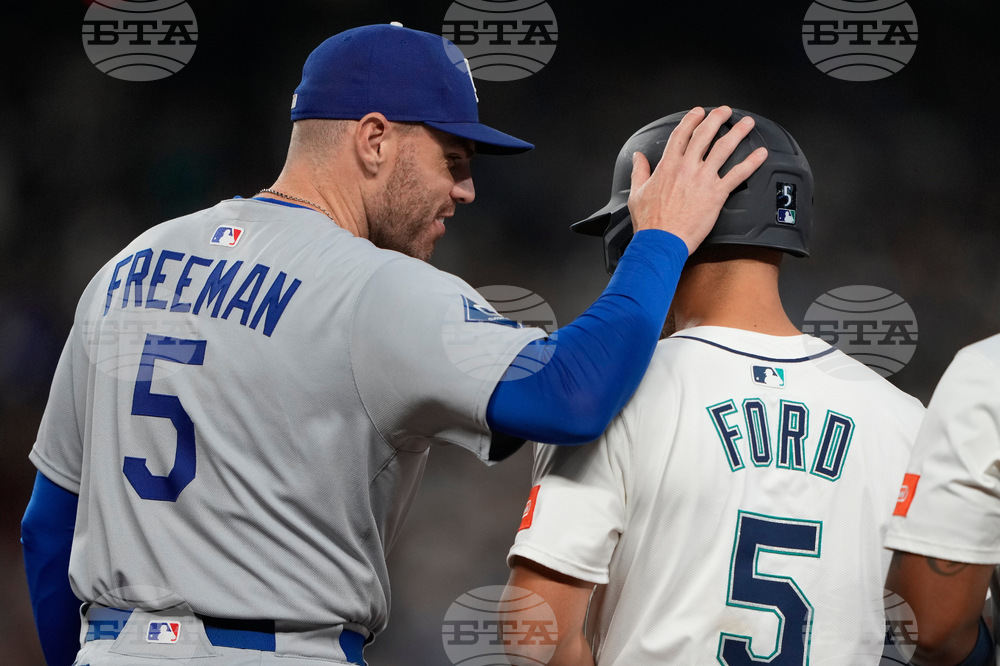 Los Angeles Dodgers first baseman Freddie Freeman, left, congratulates Seattle Mariners' Harry Ford after his first major league hit during the second inning of a baseball game, Saturday, Sept. 27, 2025, in Seattle. (AP Photo/Ryan Sun)