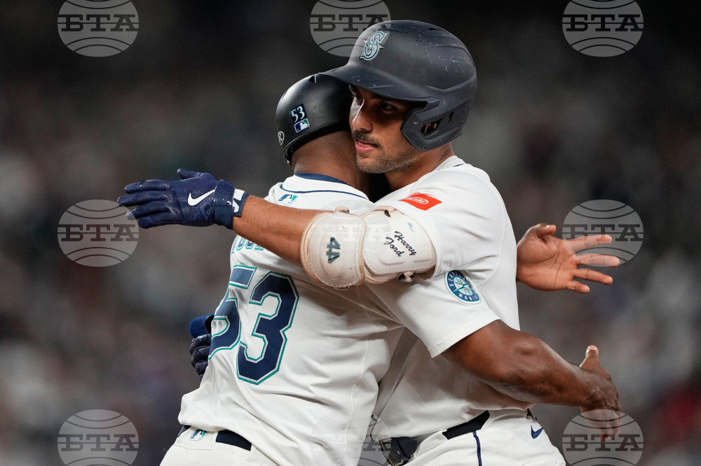 Seattle Mariners' Jorge Polanco, right, celebrates with third base coach Kristopher Negron after hitting a go-ahead three-run home run that also scored Cal Raleigh and Julio Rodriguez during the fifth inning of a baseball game against the Los Angeles Dodgers, Saturday, Sept. 27, 2025, in Seattle. (AP Photo/Ryan Sun)