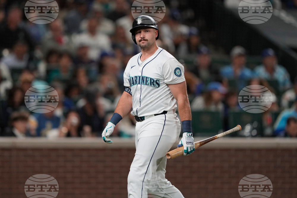 Seattle Mariners' Jorge Polanco strikes out swinging to end the seventh inning of a baseball game against the Los Angeles Dodgers, Saturday, Sept. 27, 2025, in Seattle. (AP Photo/Ryan Sun)