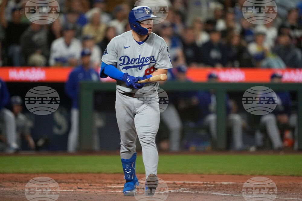 Los Angeles Dodgers' Dalton Rushing watches his two-run go-ahead home run that scored Miguel Rojas during the fifth inning of a baseball game against the Seattle Mariners, Saturday, Sept. 27, 2025, in Seattle. (AP Photo/Ryan Sun)