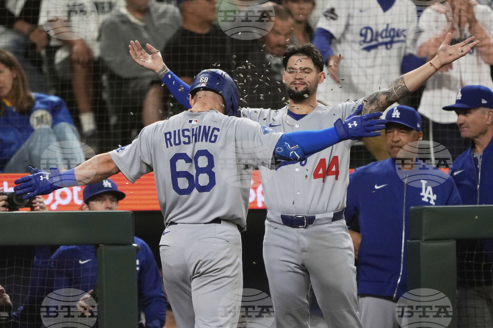 Los Angeles Dodgers' Dalton Rushing (68) celebrates with Andy Pages (44) after hitting a two-run go-ahead home run that scored Miguel Rojas during the fifth inning of a baseball game against the Seattle Mariners, Saturday, Sept. 27, 2025, in Seattle. (AP Photo/Ryan Sun)