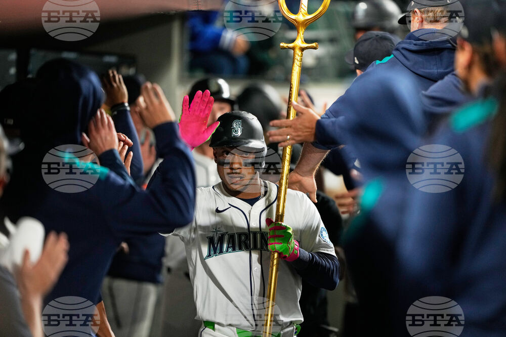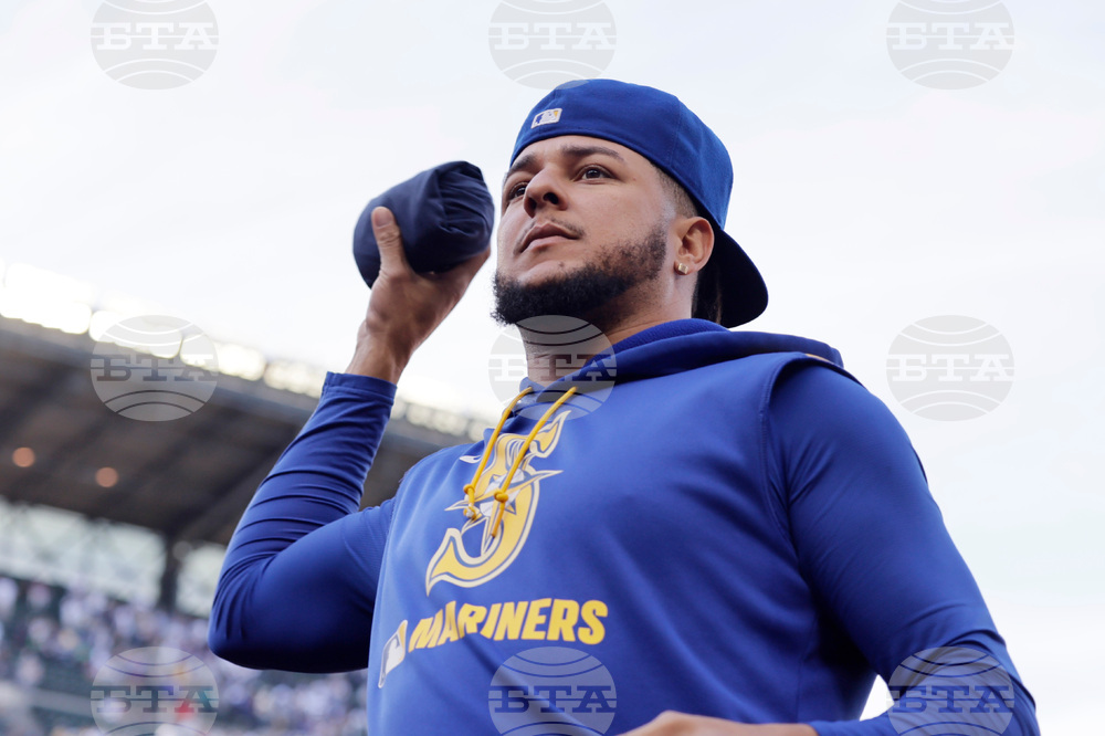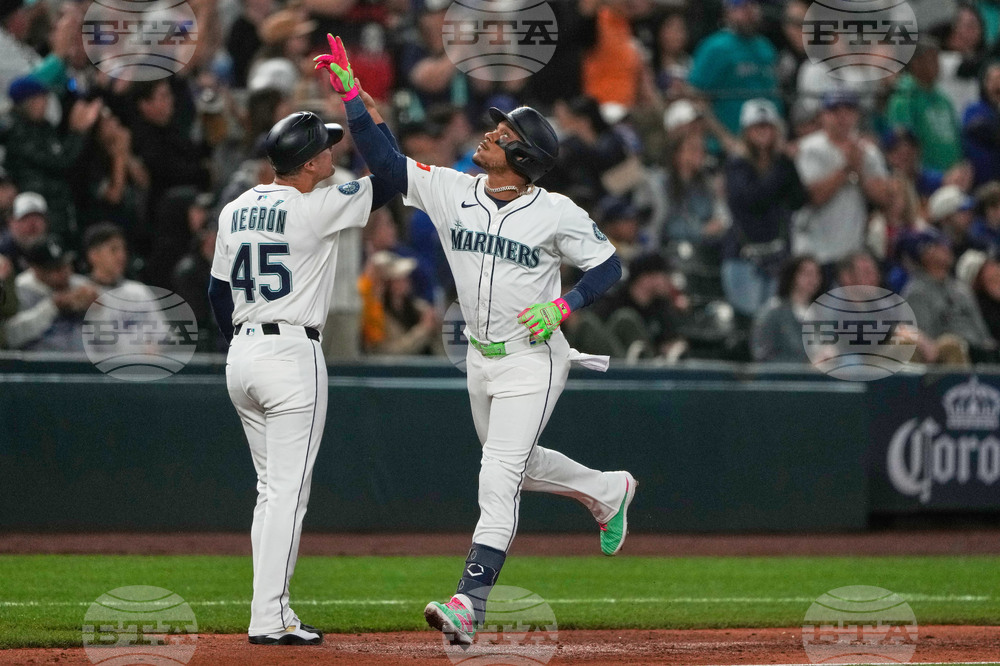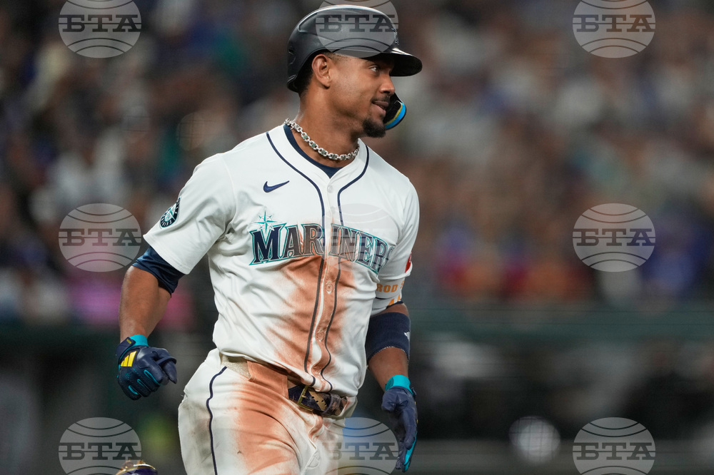 Seattle Mariners' Julio Rodriguez runs after hitting a single during the fifth inning of a baseball game against the Los Angeles Dodgers, Saturday, Sept. 27, 2025, in Seattle. (AP Photo/Ryan Sun)