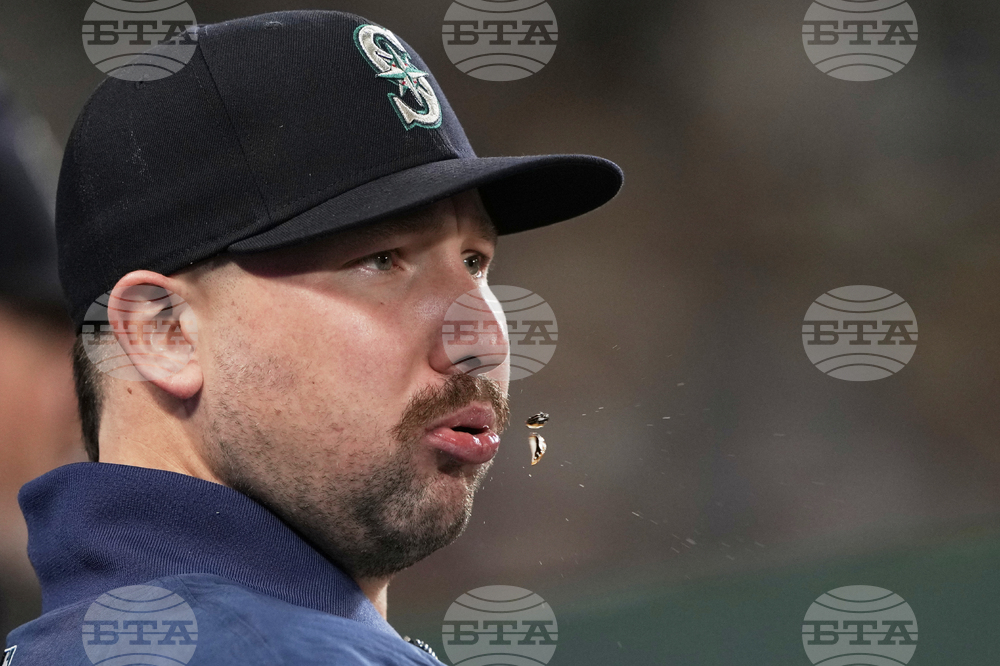 Seattle Mariners designated hitter Cal Raleigh spits out sunflower seeds in the dugout during the eighth inning of a baseball game against the Los Angeles Dodgers, Saturday, Sept. 27, 2025, in Seattle. (AP Photo/Ryan Sun)