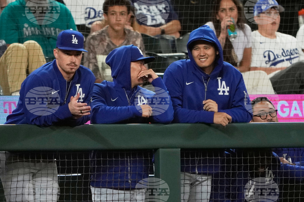 From left, Los Angeles Dodgers relief pitcher Jack Dreyer, and starting pitchers Yoshinobu Yamamoto and Shohei Ohtani stand in the dugout during the ninth inning of a baseball game against the Seattle Mariners, Saturday, Sept. 27, 2025, in Seattle. (AP Photo/Ryan Sun)