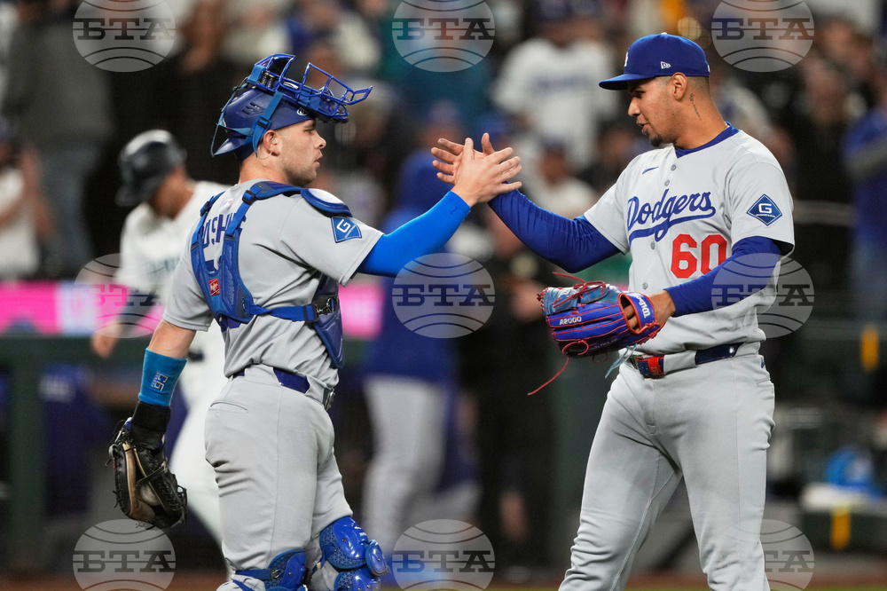 Los Angeles Dodgers relief pitcher Edgardo Henriquez celebrates after the team's win against the Seattle Mariners in a baseball game, Saturday, Sept. 27, 2025, in Seattle. (AP Photo/Ryan Sun)