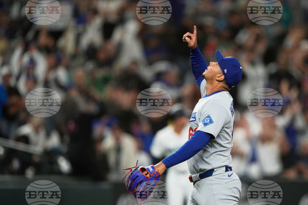 Los Angeles Dodgers relief pitcher Edgardo Henriquez reacts after striking out Seattle Mariners' Randy Arozarena swinging to end a baseball game, Saturday, Sept. 27, 2025, in Seattle. (AP Photo/Ryan Sun)
