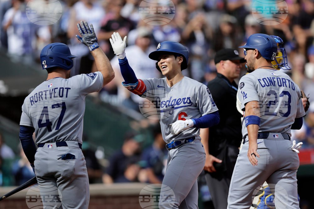 Los Angeles Dodgers' Hyeseong Kim, center, is greeted by Ben Rortvedt, left, with Michael Conforto, right, after his two-run home run hit off Seattle Mariners starting pitcher Bryce Miller during the second inning of a baseball game, Sunday, Sept. 28, 2025, in Seattle. (AP Photo/John Froschauer)
