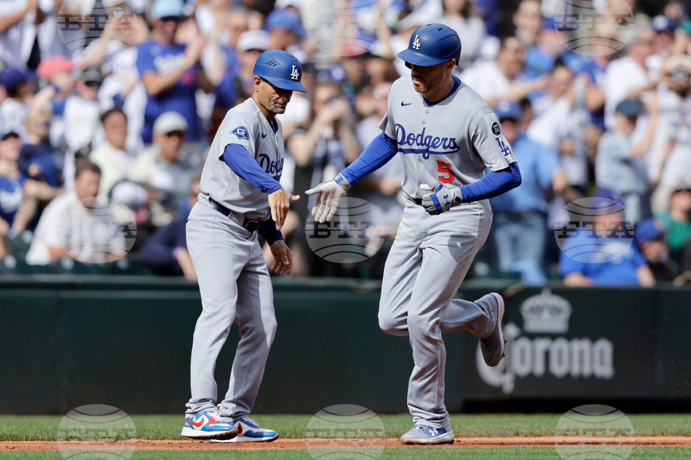 Los Angeles Dodgers' Freddie Freeman, right, is greeted by third base coach Dino Ebel, left, after hitting a two-run home run off Seattle Mariners starting pitcher Bryce Miller during the third inning of a baseball game, Sunday, Sept. 28, 2025, in Seattle. (AP Photo/John Froschauer)