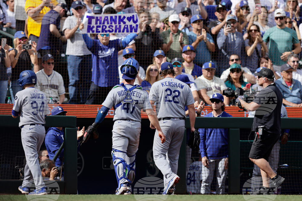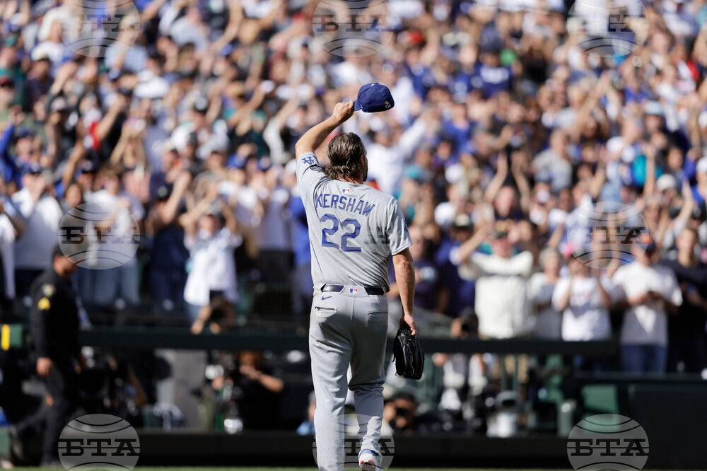 Los Angeles Dodgers pitcher Clayton Kershaw waves as he leaves during the sixth inning of a baseball game against the Seattle Mariners, Sunday, Sept. 28, 2025, in Seattle. (AP Photo/John Froschauer)