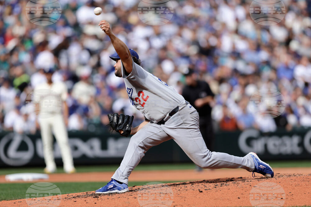Los Angeles Dodgers starting pitcher Tyler Glasnow delivers a pitch during the first inning of a baseball game against the Seattle Mariners, Saturday, Sept. 27, 2025, in Seattle. (AP Photo/Ryan Sun)