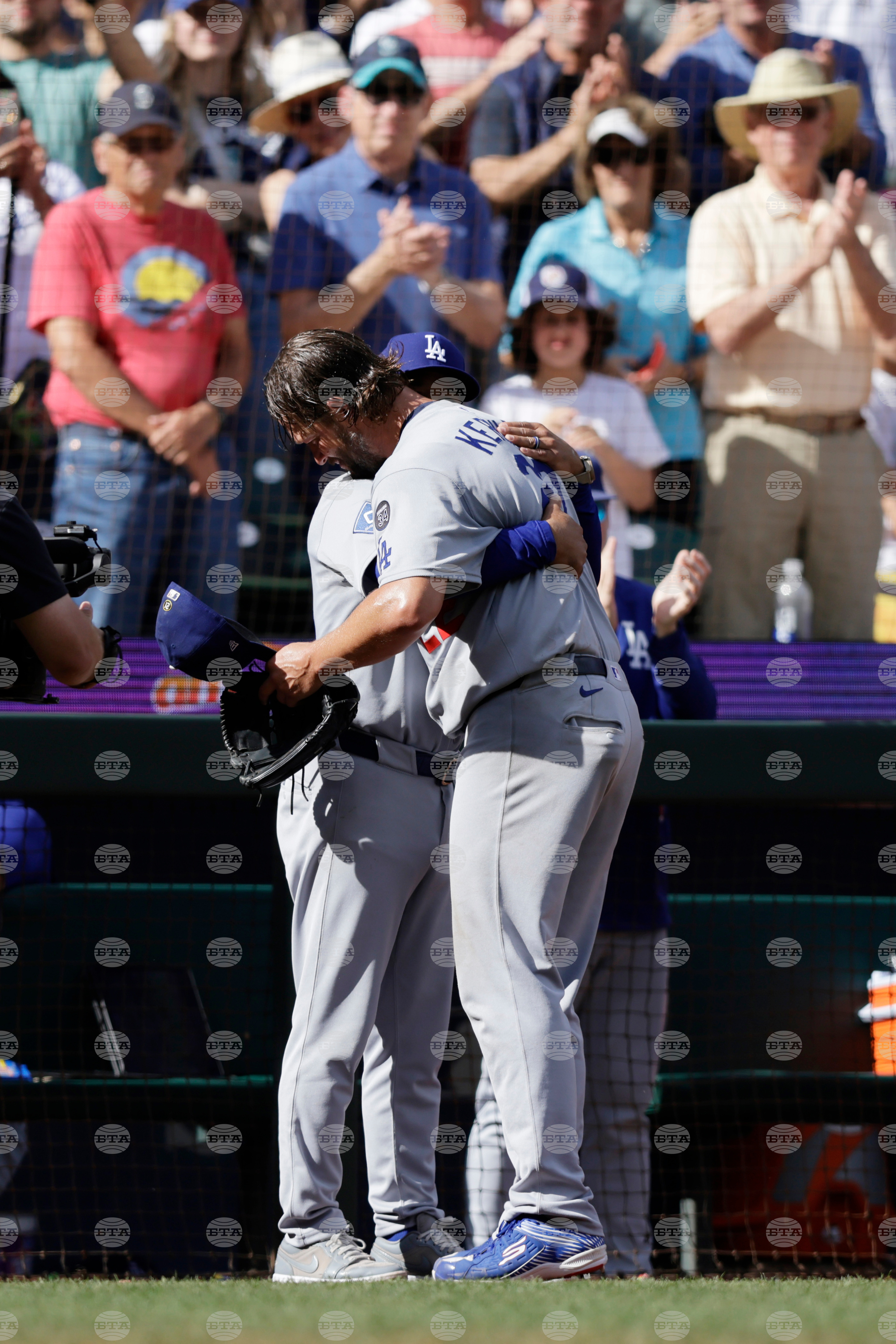 Los Angeles Dodgers pitcher Clayton Kershaw, right, hugs manager Dave Roberts, left, as he leaves during the sixth inning of a baseball game against the Seattle Mariners, Sunday, Sept. 28, 2025, in Seattle. (AP Photo/John Froschauer)