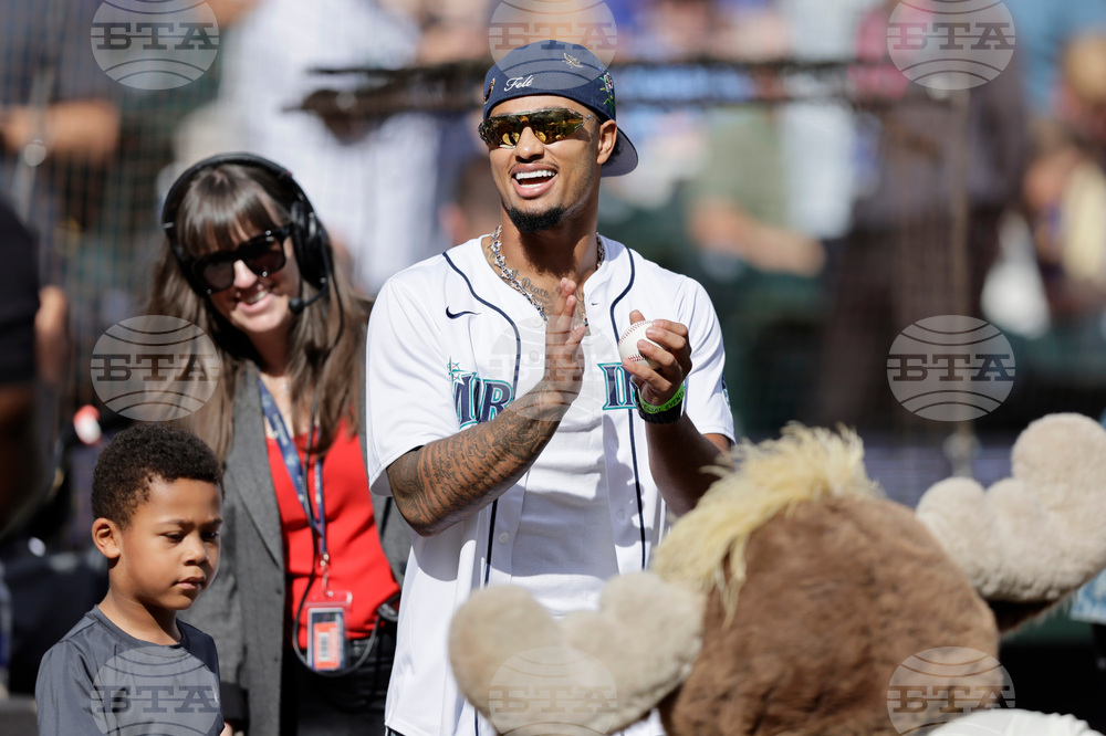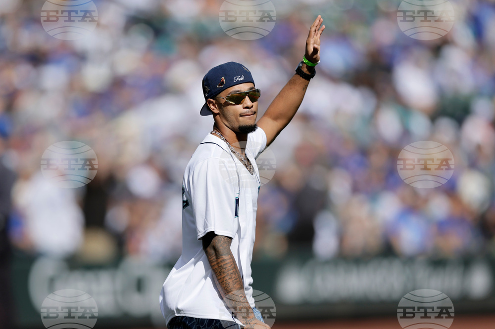 Seattle Seahawks' Jaxon Simith-Njigba throws out the first pitch before a baseball game between the Seattle Mariners and the Los Angeles Dodgers Sunday, Sept. 28, 2025, in Seattle. (AP Photo/John Froschauer)